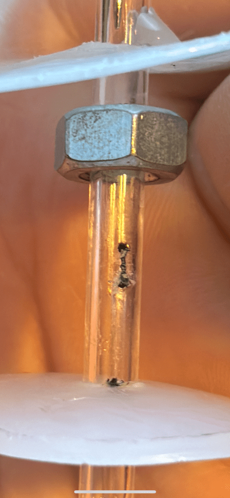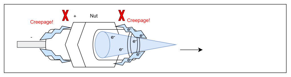 However, there was creepage. Sparks would travel across the surface of the glass tube from the cathode (the needle) to the anode (the nut).