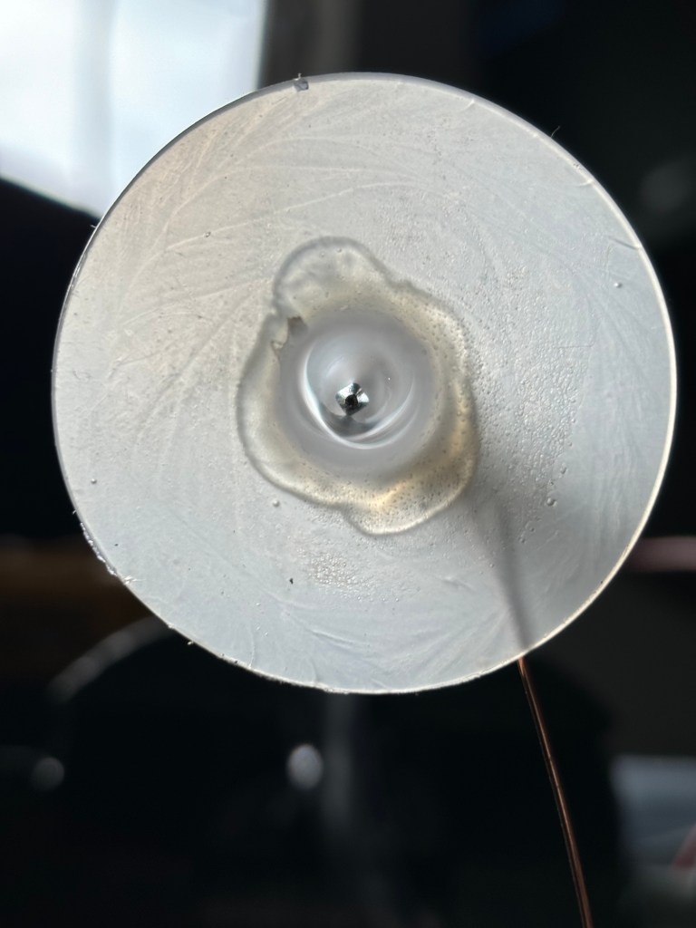 Peel off the hot glue disk. I stabbed a hole slightly smaller than the glass tube. I then threaded the tubing though the disk.