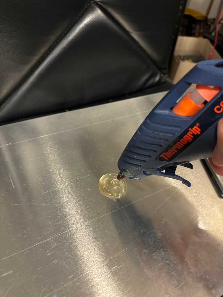 Below is a closeup of the damage. The smoke came from burning the hot glue disk.